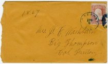 2022.19.2.68A: A letter to Albina Washburn from Sparks Randal dated March 31, 1867. In the letter he writes of an election, her paying of a debt, updates on his family and friends, and asking after L.A. Holcomb 2022.19.2.68B: An orange envelope addressed to Mrs. J.E. Washburn Big Thompson Colorado Territory. |